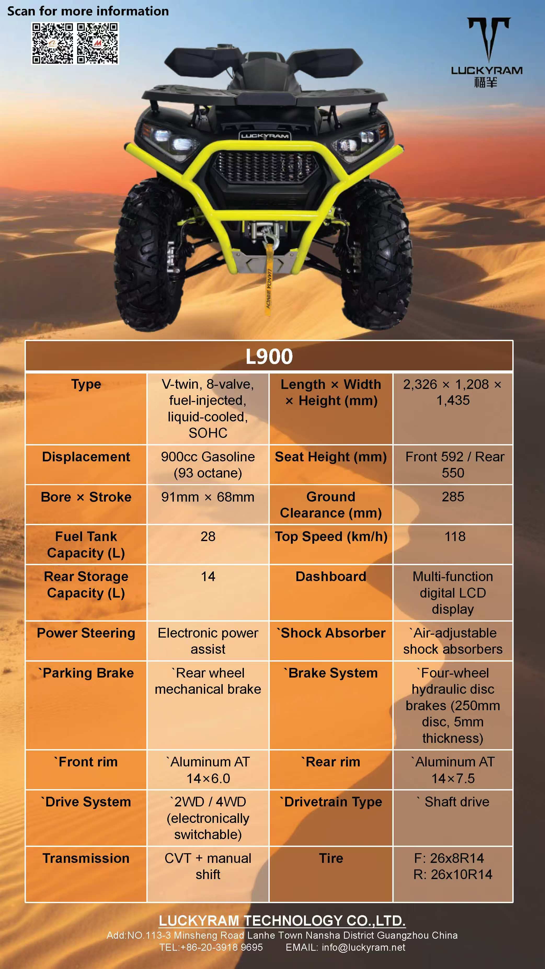 Inneall cumhachtach-feistithe le hinneall ardfheidhmíochta 900cc 4-stróc, ag seachadadh chasmhóiminte agus luasghéarú láidir le haghaidh eachtraí easbhóthair. Tarraingt níos fearr i láib, gaineamh, agus conairí creagach. Coinníollacha.Sochtanna In-In-Inmharthana-Coscáin Diosca Hiodrálacha (Tosaigh & Cúl) Cinntigh stadanna gasta, sábháilte fiú ag luas ard. Chun fearas agus tarrtháil a iompar - Feidhmíocht iontaofa i dtréimhse iargúlta nó deacair do mhisin éigeandála.